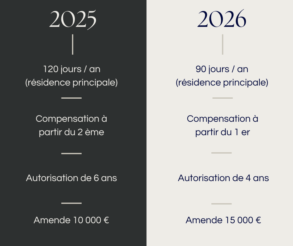 La mesure phare de 2026 : depuis le 1er janvier, la durée maximale de location d'une résidence principale passe de 120 jours à 90 jours par an.